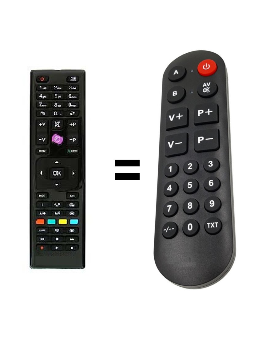 Only basic functions can be controlled: On, Off, Volume, Programs, Inputs, OK and EXIT. On request, we can program the switching on and off of another device (Specify the model in the note in the order.) For example, if you buy a remote control for DVB-T, we will program another button to turn on the TV. TXT button on our senior remote control will be work as POWER/OF TV.