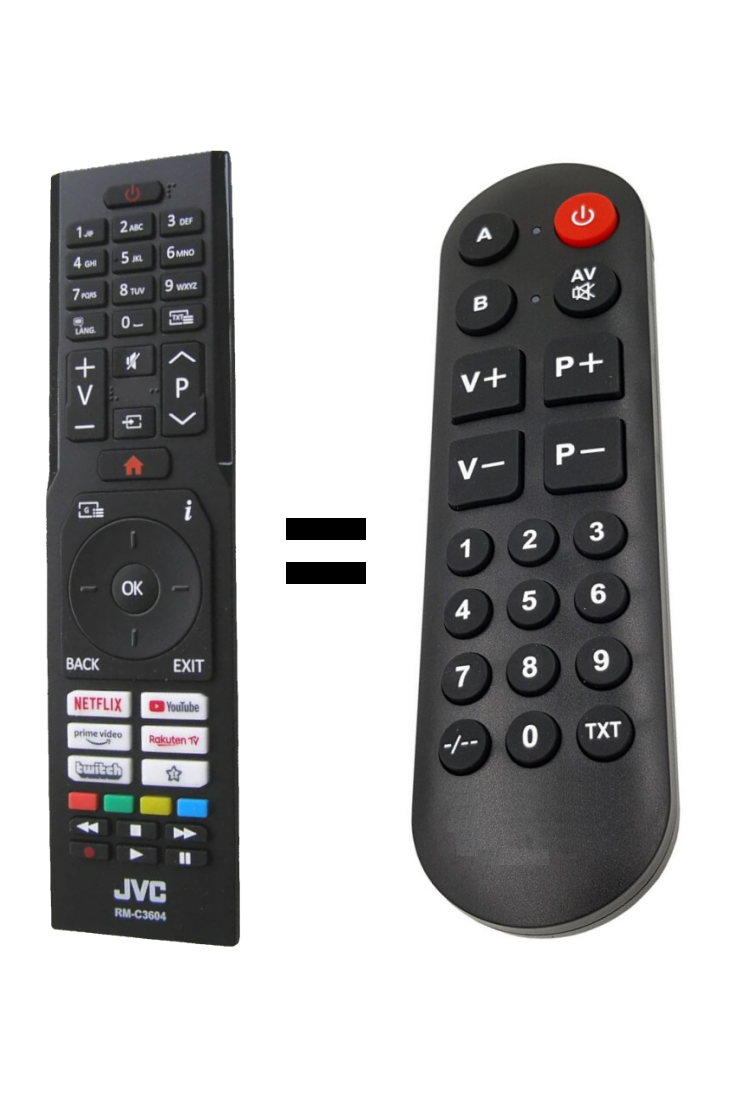 BASIC FUNCTIONS ONLY. JVC replacement remote control. NO CODES NEEDED. For example, for LT-24VH5205, LT24VH5205, LT-43VF5105, LT-55VU3100, LT 32VAF3001 LT 43VU6205, LT-43VU3305, LT-50VU3305, LT-43VU8156, LT43VU3300, LT43VU8156 LT 55VU3100, LT 43VU6205, LT 43VU3100, LT-32VAF3001, LT-32VF5105, LT-43VU6205, LT-55VU3100, LT-65VU3105, LT24VH3100, LT24VH5105, LT24VH5156, LT32VF5105, LT32VF5157, LT32VFE5255, LT32VH3100, LT32VH3100S, LT32VH5105, LT32VH5156, LT32VHE5100, LT32VHE5155, LT40VF3000, LT40VF3055, LT43K8100, LT43VF5105, LT43VFE5155, LT43VU2205, LT43VU2255, LT43VU3100, LT43VU3105, LT43VU6205, LT50K8100, LT50VU2205, LT50VU3100, LT50VU6205, LT50VU8156, LT55K8100, LT55VU2205, LT55VU3100, LT55VU3105, LT55VU6205, LT65VU3100, LT65VU3105.