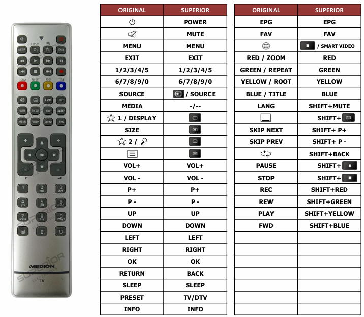 The replacement for the original Medion remote control for this device is the branded EMERX PReDATOR remote control (in right), which has a different appearance (color, button layout, etc.), but the same functions as the original Medion remote control. We offer the EMERX PReDATOR remote control as a cheaper alternative to the original remote control or because this original remote control is no longer manufactured. You do not have to program the remote control sent by us in any way. It will be set up exactly for your Medion device, while retaining all the features.