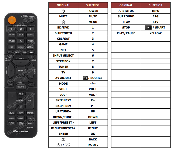 The replacement for the original Pioneer remote control for this device is the branded EMERX PReDATOR remote control (in right), which has a different appearance (color, button layout, etc.), but the same functions as the original Pioneer remote control. We offer the EMERX PReDATOR remote control as a cheaper alternative to the original remote control or because this original remote control is no longer manufactured. You do not have to program the remote control sent by us in any way. It will be set up exactly for your Pioneer device, while retaining all the features.