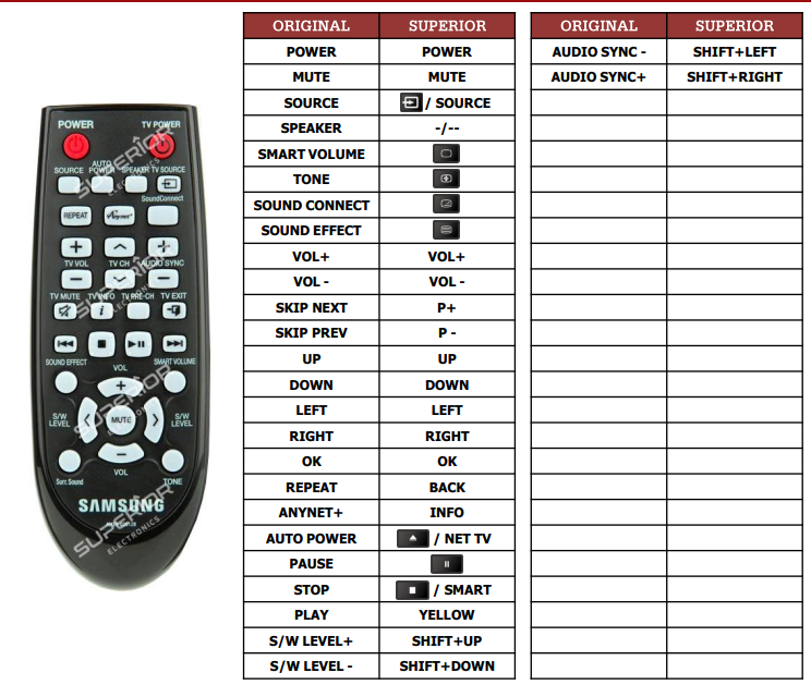 The replacement for the original Samsung remote control for this device is the branded EMERX PReDATOR remote control (in right), which has a different appearance (color, button layout, etc.), but the same functions as the original Samsung remote control. We offer the EMERX PReDATOR remote control as a cheaper alternative to the original remote control or because this original remote control is no longer manufactured. You do not have to program the remote control sent by us in any way. It will be set up exactly for your Samsung device, while retaining all the features.