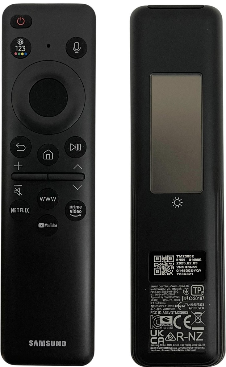 Voice control, solar charging. Original Samsung remote control. For example, for models: BE43FX-H, BE50FX-H2, BE50FX-H, BE55FX-H2, BE55FX-H, BE65FX-H2, BE65FX-H, BE75FX-H2, BE75FX-H, BE85FX-H2, BE85FX-H, S32FM700UA, S32FM700UE, S32FM700UU, S32FM702UC, S32FM702UI, S32FM702UU, S32FM702UZ, S32FM900SM, S32FM900SU, S32FM902SC, S32FM902SE, S32FM902SI, S32FM902SL, S32FM902SU, S32FM902SZ, S43FM700UL, S43FM700UU, S43FM702UC, S43FM702UE, S43FM702UM, S43FM702UU, MRA115MR95F, QA100QN80FJ, QA100QN80FK, QA100QN80FU, QA100QN80FX, QA115QN90FK, QA115QN90FU, Read more ...