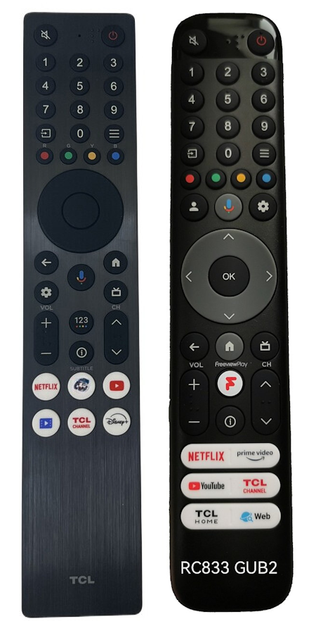 Original remote control for TCL TVs. For example for 75C7K, 65C7K, 55C7K, 50C7K, 115C7K, 98C7K, 85C7K, 75P6K, 65P6K, 55P6K, 50P6K, 43P6K. Also replaces RC813A FMB1 remote control without number buttons for 55C755, 65C755, 75C755, G0401-000253, JH-24161. 55C69K. WE ARE SENDING THE NEW MODEL ON THE PICTURE RC833 GUB2.