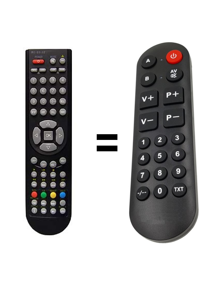 Only basic functions can be controlled: On, Off, Volume, Programs, Inputs, OK and EXIT. On request, we can program the switching on and off of another device (Specify the model in the note in the order.) For example, if you buy a remote control for DVB-T, we will program another button to turn on the TV. TXT button on our senior remote control will be work as POWER/OF TV.
